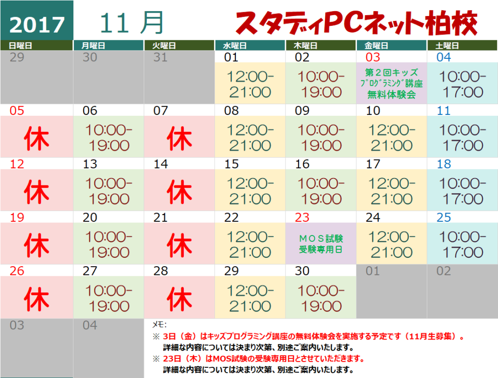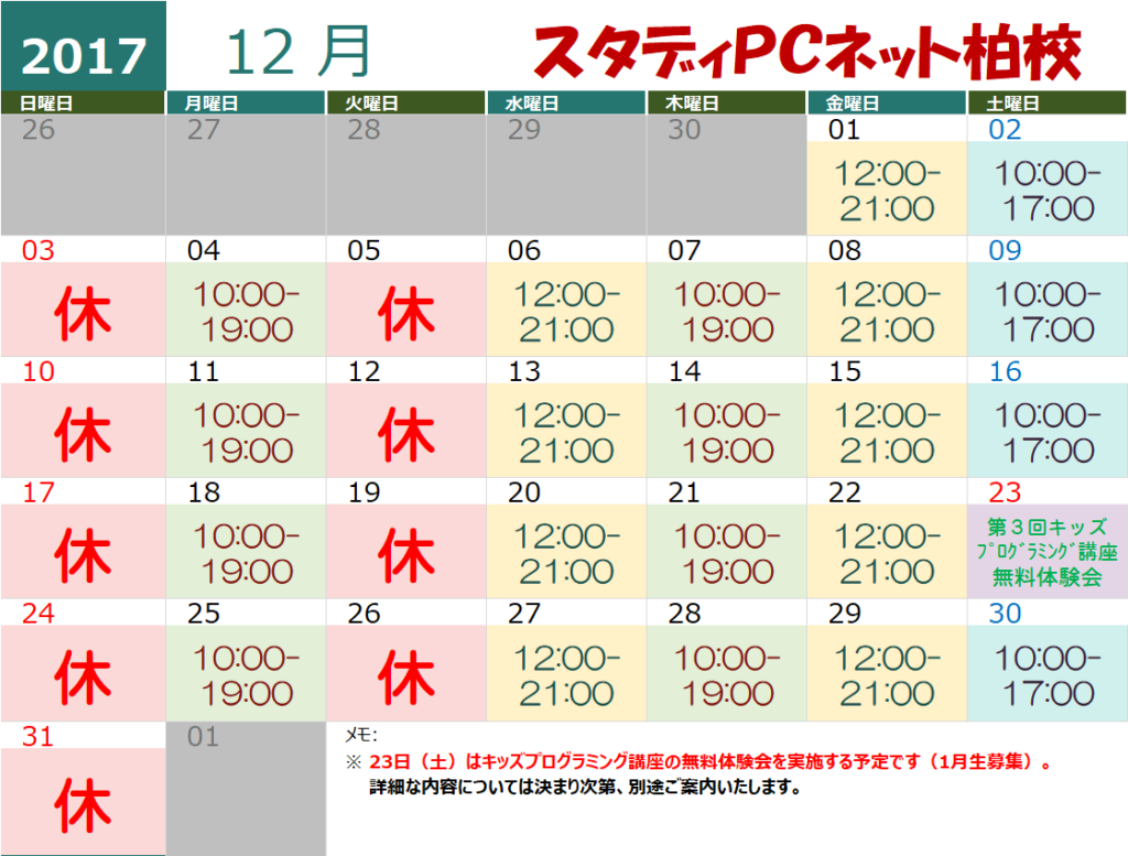 2017年11月(修正版)と12月の営業カレンダー