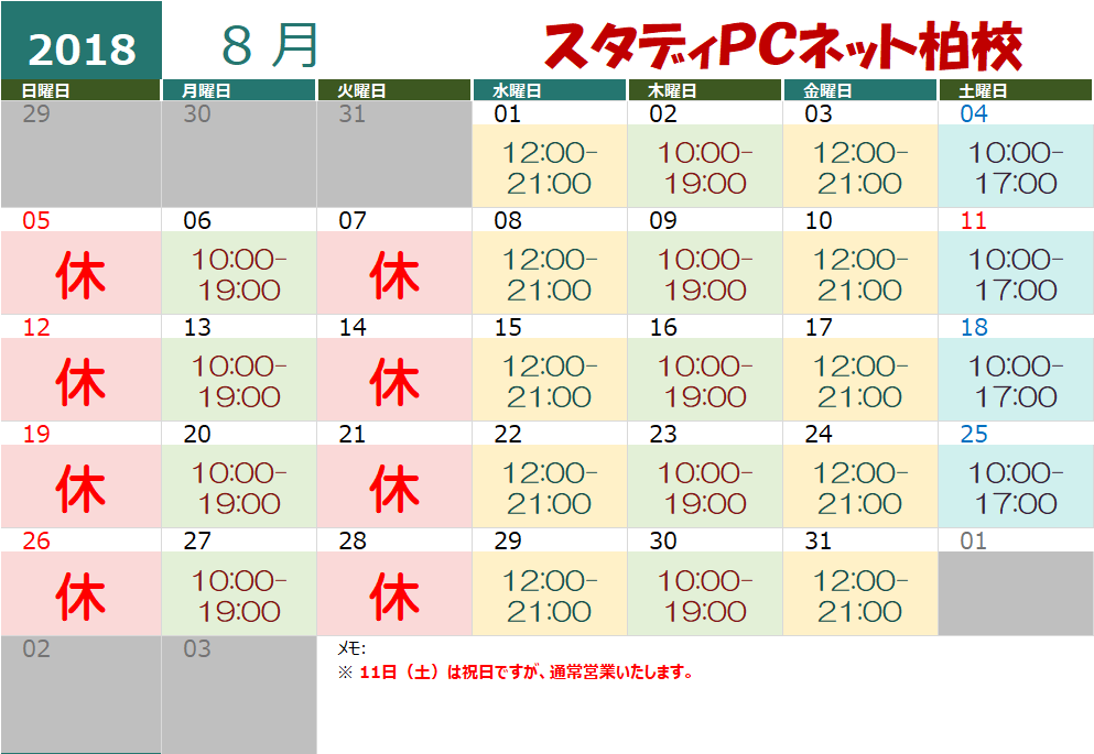 2018年8月と9月の営業カレンダー
